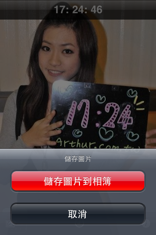 下方icon由左至右為:另存圖片、鬧鐘設定時間、時計設定